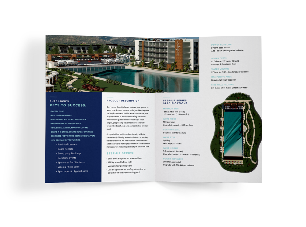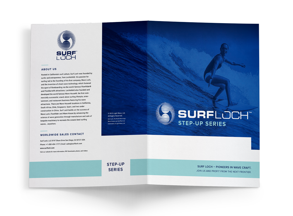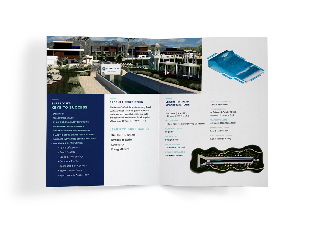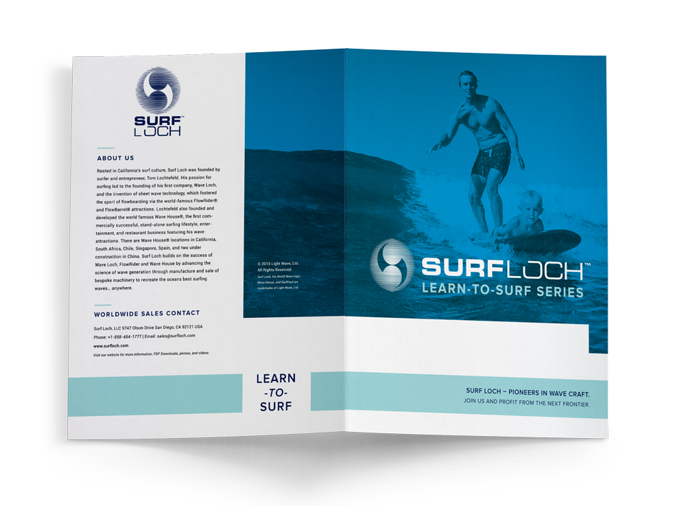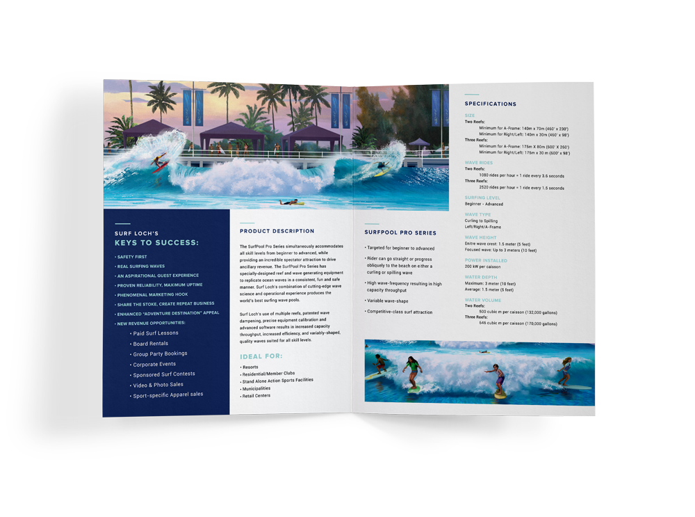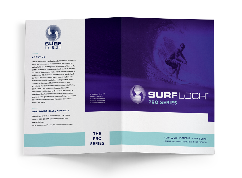 Surfloch is an international wave machine brand, offering attraction installments on cruise ships and waterparks as well as their own standalone locations. These color-coded brochures were developed to explain the capabilites of Surfloch's 3 main wave-producing products at The International Association of Amusement Parks and Attractions (IAAPA) tradeshow in Orlando .